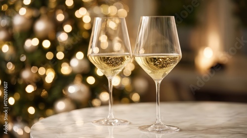 Elegant Holiday Celebration: Two Glasses of Sparkling Wine with Festive Christmas Tree Backdrop