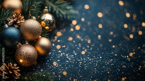 christmas, holiday, decoration, ornament, pine, branch, festive, gold, blue, glistering, sparkling, background, season, celebration, winter, new, year, shiny, bauble, pine cone, joy, warmth, decor, traditional, festivity, cheerful, cosy, elegance, mood, beautiful, bright, seasonal, greenery, ornamental, light, bokeh, glittering, table, setting, party, magical, handcraft, spirit, decoration, ball, christmas, december, tree, merry