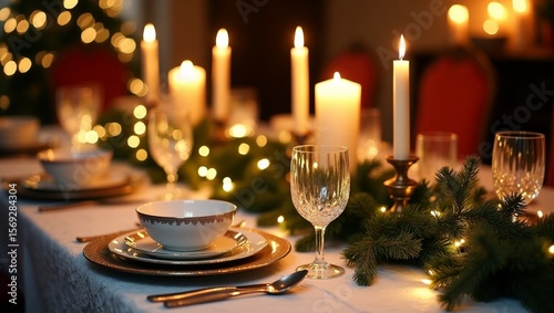 Elegant Holiday Table Setting with Candles and Pine Garlands