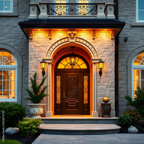 house, entrance, door, architecture, home, exterior, building, luxury, night, evening, residential, stone, design, elegant, grand, facades, lighting, warm, window, porch, balcony, ornate, decor, style