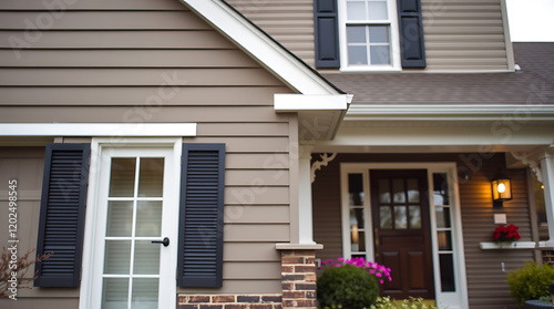 Elegant Home Exterior: Brown Siding, White Trim, and Black Shutters. Beautiful House Design and Architecture. Real Estate Photography