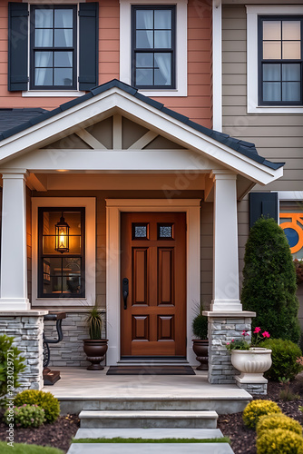 Elegant Home Exterior: Modern House with Stone Porch and Wooden Door