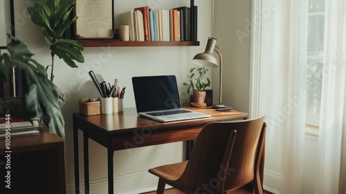 Elegant home office with a stylish chair, desk, laptop, and black frame, organized books and decor items, offering ample copy space