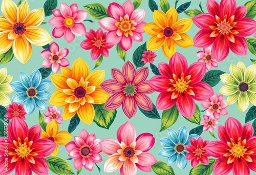 Elegant horizontal seamless pattern of vibrant, abstract colorful flowers , digital, petals