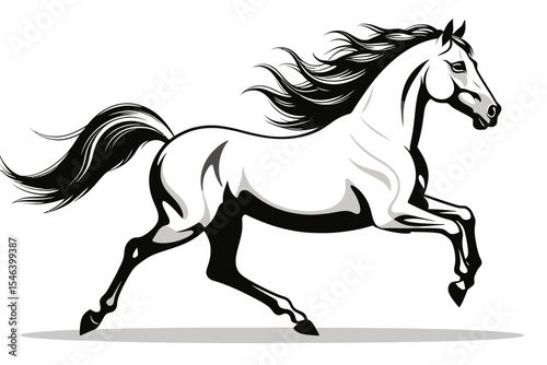 horse, running, black, white, equine, fast horse, animal, mammal, illustration, graphic, art, drawing, vector, isolated, mane, tail, breed, mustang, silhouette, power, elegant, freedom, strength, speed, wild, nature, design, style, symbol, tattoo, logotype, mascot, racer, gallop, equestrian