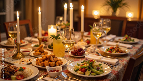 dinner, celebration, feast, festive, cosy, dining, food, elegant, table, candle, plate, drink, atmosphere, closeup, warmth, family, friends, gathering, joyous, decor, design, hospitality, evening, tradition, cultural, sharing, diversity, dish, variety, vibrant, colours, texture, ambience, epicure, style, delicious, appetising, inviting, favor, serve, multiple, no people, adult, indoor, setting, home
