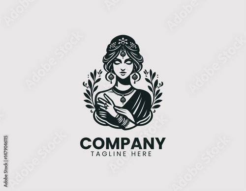 vector, logotype, design, beautiful woman, charming female, namaste, traditional, jewellery, jewellery, ornament, praying, elegant, graceful, beautiful, charming, regal, female, lady, indian, india, culture, tradition, beauty, portrait, illustration, art, graphic design, brand, identity, symbol, icon, cardboard box, product, decoration, t-shirt, merchandise, apparel