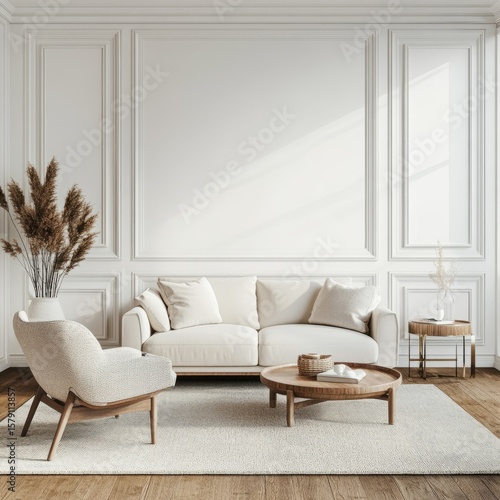 Elegant interior design, with a comfortable sofa, chair, and a round coffee table, placed on the plush rug, exuding a sense of calm and sophistication.