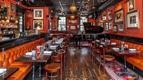 bar, eatery, pub, interior, design, decor, elegant, stylish, upscale, vintage, traditional, classic, piano, music, live music, nightlife, entertainment, dining, table, chair, booth, red, orange, brown, wood, wooden, floor, wall, picture, frame, artwork, light, lamp, chandelier, stool, drink, goggles, napkin, candle, cosy, inviting, atmosphere, ambience