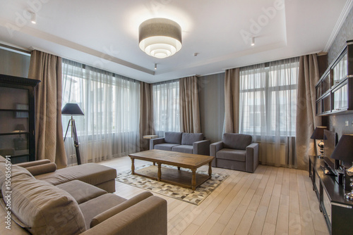 Elegant interior of the living room with large windows. The room is decorated in beige and gray tones. Elegant furniture.