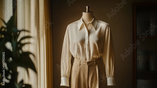 fashion, style, clothing, blouse, trousers, mannequin, chic, elegant, atelier, tailoring, outfit, garment, design, stylish, classic, contemporary, neutral, toned, colours, indoor, studio, daytime, fabric, texture, smooth, soft, refined, minimalist, aesthetic, vogue, sewing, artisan, creation, trend, clothes rack, attire, sartorial, formal, casual attire, collection