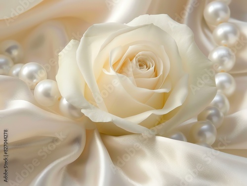 Elegant ivory rose on a silky fabric background, adorned with pearls. Perfect for wedding or romantic themed designs and decor.