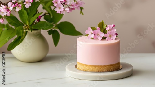 Elegant Japanese sakura cheesecake with a marbled pink glaze and edible blossoms on top soft romantic tones for spring celebrations
