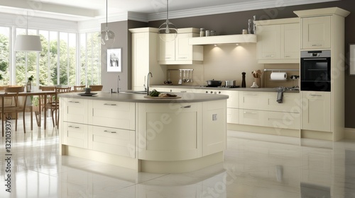 kitchen, island, cabinet, interior, design, countertop, dining table, window, modern, home, furniture, sink, oven, appliance, cooktop, drawer, lighting, table setting, utensil, indoor, room, house, residence, apartment, architecture, decor, style, domestic, household, eating, preparing, cooking, nobody, renovation, improvement, residential, lifestyle, luxury, cream