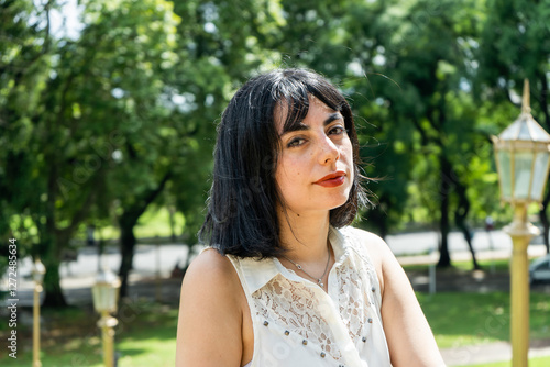 woman, latin, hispanic, elegant, classic, park, street light, posing, portrait, fashion, beauty, style, lifestyle, nature, tree, green, summer, day, sunlight, confident, serious, expression, attractive, beautiful, young, adult, casual attire, clothing, white shirt, dark hair, necklace, make-up, lipstick, model, serene, peaceful, urban, background, city, lamp-post, greenery, leaf, branch, relaxation, calmness