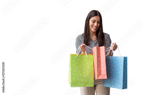 business, client, businesswoman, people, lifestyle, entrepreneur, person, woman, female, shopping, retail, consumerism, mall, shopping bag, store, purchase, fashion, discount, consumer, sale, product, young, caucasian, hispanic, latin, spanish, lady, smile, portrait, economy, happy, transparent, background, isolated