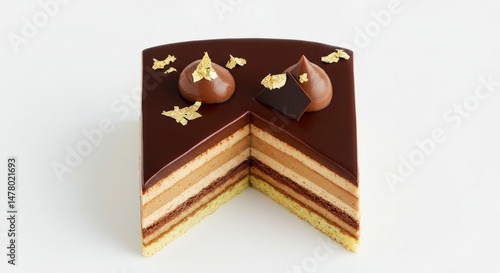 Elegant Layered Chocolate Cake Slice with Gold Leaf Decoration on White Background