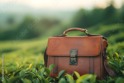 Elegant Leather Satchel Bag Displayed on Fresh Green Tea Leaves with a Serene Natural Background in Soft Daylight