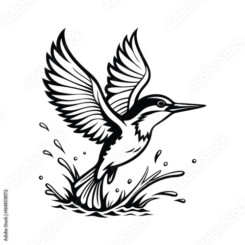Elegant line art illustration of a kingfisher bird in mid flight diving towards water
