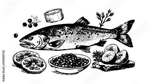 Elegant Line Art Illustration Salmon with Caviar and Lemon