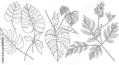 Elegant Line Art Tropical Leaves Botanical Illustration Monstera Ferns Berries