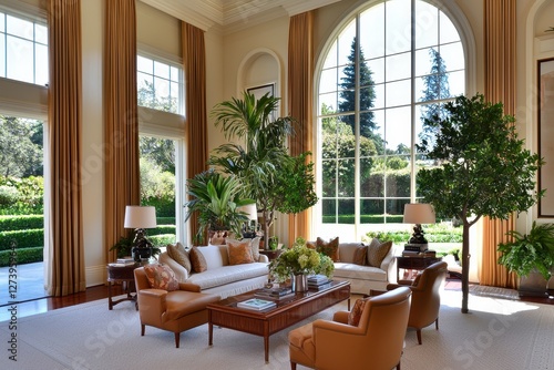 Elegant Living Room Interior with Natural Light from Large Windows and Lush Greenery Creating a Serene Atmosphere