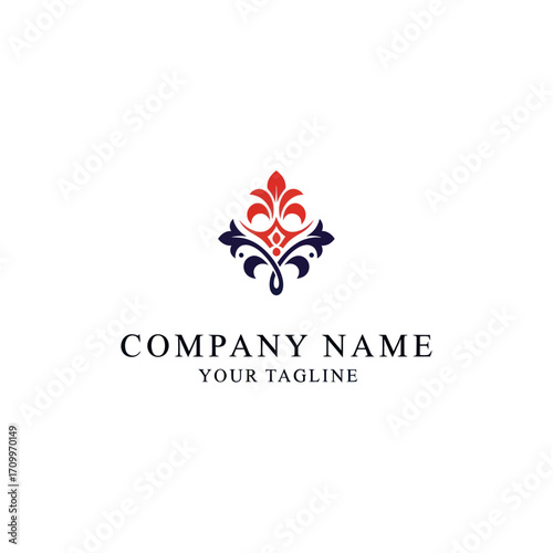 Elegant logo design featuring a stylized floral emblem in red and dark blue, perfect for a luxury brand.
