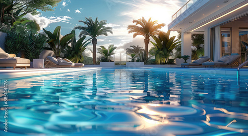 Elegant luxurious pool party, no people, beautiful peaceful, fun, happy. Generative AI.