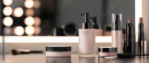 make-up, vanity, beauty, product, lotion, lipstick, brush, mirror, illuminated, modern, elegant, stylish, cosmetic, skincare, glamour, fashion, feminine, chic, luxury, interior, design, decor, professional, lighting, clean, organised, aesthetic, trendy, contemporary, lifestyle, pampering, routine, daily, essential, accessory, personal, care, grooming, sophisticated