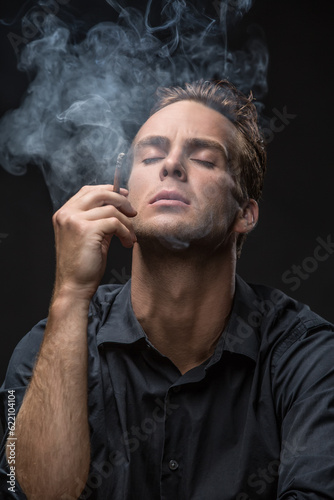 Elegant man in dark shirt smokes with closed eyes on the black background in the studio. He holds a cigarette in the right hand. Smoke swirls around him. Vertical low-key photo.