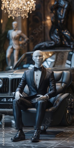 mannequin, suit, elegant, luxury, car, dealership, sitting, waiting, client, business, fashion, style, showroom, automobile, interior, design, modern, retail, display, commerce, consumerism, wealth, upscale, sophistication, automotive, transportation, vehicle, new, sale, clothing, menswear, tuxedo, bow, attaching, leather, shoe, watch, expensive, seat, retailer