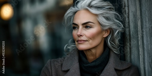 woman, grey hair, mature, elegant, serene, outdoors, beauty, light, gaze, expression, age, complexion, coat, portrait, background, lifestyle, appearance, charme, grace, style, sophistication, mood, profile, glance, scene, person, clothing, fashion, calmness, composure, adulthood, seniority, wisdom, countenance, individuality