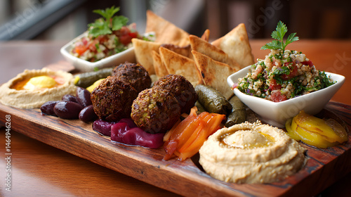 Elegant Mediterranean Vegan Mezze Platter with Hummus, Falafel, Dolmas, Olives, and Tabbouleh (AI Image)