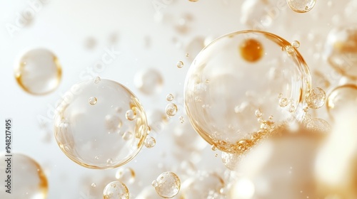 Elegant Minimalist Design Featuring Gold Bubbles on White Background, Clean Lines, High-End Aesthetic, and Soft Lighting with Blurred Foreground and Background for High-Resolution Visual Art.