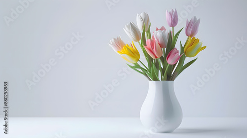 Elegant mixed pastel colored spring bouquet in white vase on white background Spring flowers Tulips bouquet : Generative AI