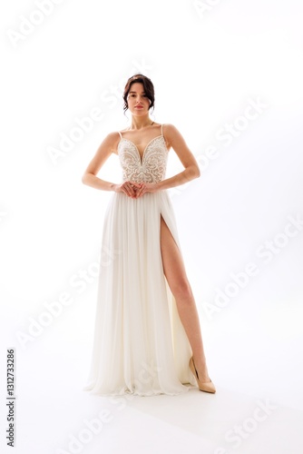 Elegant model showcasing a beautiful bridal gown with intricate detailing and a thigh-high slit in a pristine studio setting
