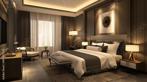 modern, interior, design, bedchamber, comfort, lighting, stylish, bed, elegance, luxury, relaxation, contemporary, minimalism, warmth, cosy, home, sleep, calmness, trend, sophistication, pillow, lamp, curtain, carpet, artwork, mirror, duvet, headboard, window, floor lamp, night, peaceful, rest, textile, decoration, furniture, residential, indoor, no people