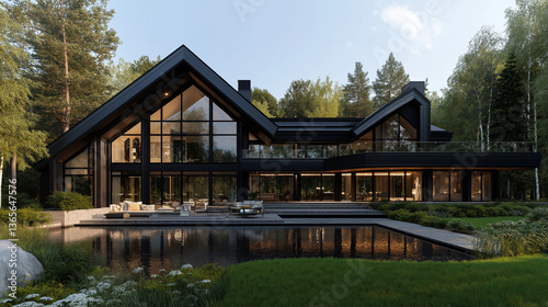 Elegant Modern Home: Capturing the essence of contemporary luxury, a stunning modern house with sleek lines and expansive glass windows reflects in a serene pool of water.