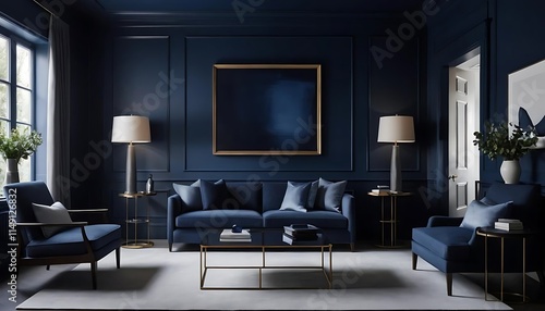 blue, living, room, interior, design, sofa, couch, chair, armchair, lamp, table, hot drink, gold, brass, modern, contemporary, elegant, sophisticated, plush, velvet, cushion, pillow, floor, carpet, rug, wall, paneling, molding, artwork, painting, frame, window, curtain, vase, plant, flower, style, home, decor, luxury, ambience, comfort
