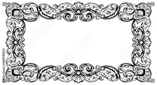 Elegant ornate black and white decorative frame with intricate floral scrollwork and shell motifs