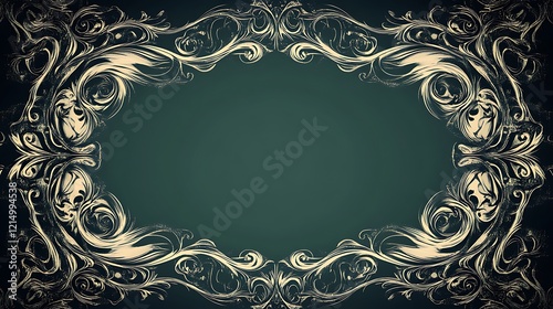 frame, ornate, swirl, flourishes, elegant, design, background, texture, abstract, art, vintage, antique, baroque, rococo, pattern, gold, beige, cream, dark, green, teal, black, graphic, decorative, illustration, wallpaper, border, template, invitation, card, luxury, sophisticated, classic, style, motif, scroll, detail, element, symmetric, paisley, floral, filigree