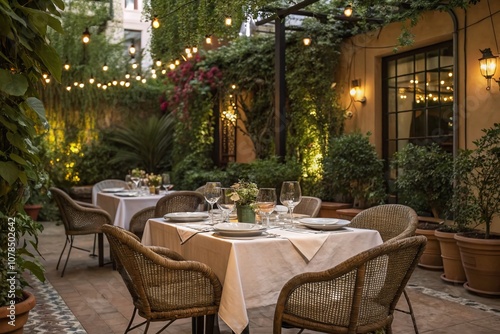 Elegant Outdoor Restaurant Setting with Empty Table and Chairs, Perfect for Al Fresco Dining, Showcasing Cozy Ambiance and Beautiful Decor Elements in a Lush Garden