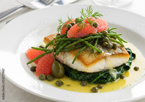 Elegant Pan Seared Halibut with Grapefruit Samphire and Capers on Spinach