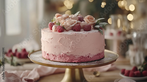 Elegant Pastel Cake with Raspberry Layers and Rose Cream on a Vintage Stand