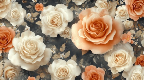 rose, peach, cream, floral, design, flower, background, wallpaper, texture, image, art, illustration, blossom, bloom, flower petals, leaf, romantic, elegant, beautiful, delicate, soft, pastel, vintage, antique, classic, style, pattern, dark, grey, painting, picture, garden, nature, botany, plant, pretty, detail, ornate, lush