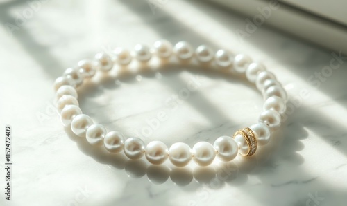 Elegant pearl bracelet with delicate gold clasps, placed on a marble counter under soft natural light,