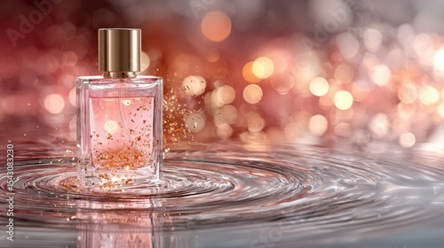 perfume, bottle, fragrance, luxury, beauty, cosmetic, fashion, elegant, water, ripple, sparkling, gold, pink, glasses, display, product, advertising, glamour, accessory, modern, cardboard box, scent, aesthetic, trend, image, visual, promotion, marketing