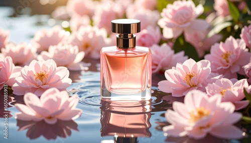 Elegant perfume bottle surrounded by delicate pink lotus flowers floating on water.