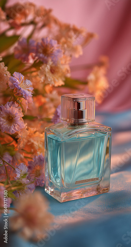 Elegant perfume bottle with soft floral background and shimmering liquid