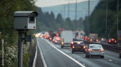 Elegant photo of speed camera is monitoring a busy traffic road, highlighting the importance of speed control and road safety on highways.